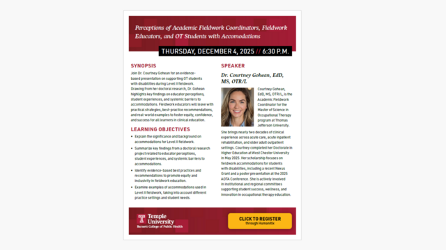 Join Dr. Courtney Gohean for an evidence-based presentation on supporting OT students with disabilities during Level II fieldwork. Drawing from her doctoral research, Dr. Gohean highlights key findings on educator perceptions, student experiences, and systemic barriers to accommodations. Fieldwork educators will leave with practical strategies, best-practice recommendations, and real-world examples to foster equity, confidence, and success for all learners in clinical education.