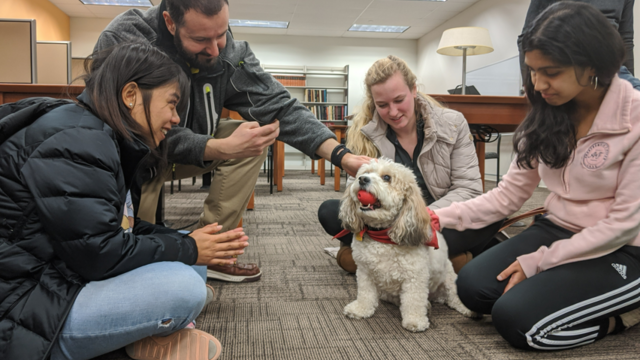 Join us for a relaxing afternoon at Ginsburg Library (Health Sciences Campus) with our special therapy dog friends at our "Paws for a Break" event. This unique gathering features three exceptional therapy dogs who are dedicated to providing comfort and companionship to those in need. The event is designed to promote relaxation, reduce stress, and foster a sense of community among attendees. Meet our featured therapy dogs, each with their own unique personality and charm. They are certified and accompanied by experienced handlers who will guide you through the experience. You will have the opportunity to interact with these wonderful dogs, learn about the benefits of therapy animals, and enjoy some quality time with furry friends!