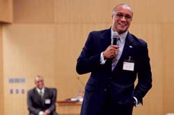 As keynote speakers for the showcase, medical school graduates and current adjunct faculty Vince and Vance Moss shared experiences that have thrust them into the international spotlight. Since graduating in 1998, the twin physicians and Army reservists have carried out three humanitarian aid trips to Afghanistan with their own resources. They described the risks they endured while helping Afghani civilians particularly women and children. In recognition of their work, ABC News named them the News People of the Year for 2008.