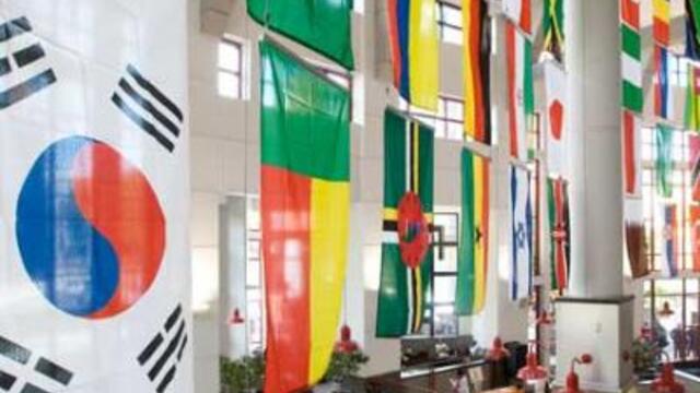The first four flags U.S.A., China, India and South Korea signify the countries that currently send the most students to Temple. The remaining 40 illustrate one quarter of the approximately 160 countries represented by the student body. Each year the flags will be rotated so that within a four-year stay at Temple, each student will have an opportunity to see his or her flag.