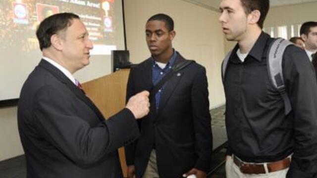 Aron s visit preceded Temple Night at the Wells Fargo Center for the March 27 game against the Cleveland Cavaliers. The 7 p.m. game will feature members of Temple s men s basketball team, cheerleaders and the university Diamond Band.