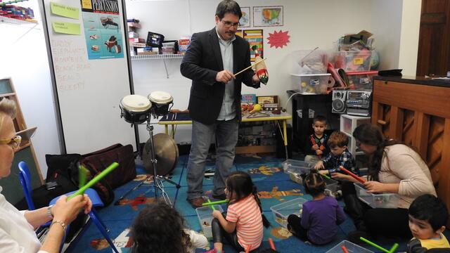 Steven Weiser, BYR ’02, ’04, teaches a percussion lesson to a group of students during a school visit. Weiser has served as the executive director of the Erie Philharmonic since 2015, and under his le